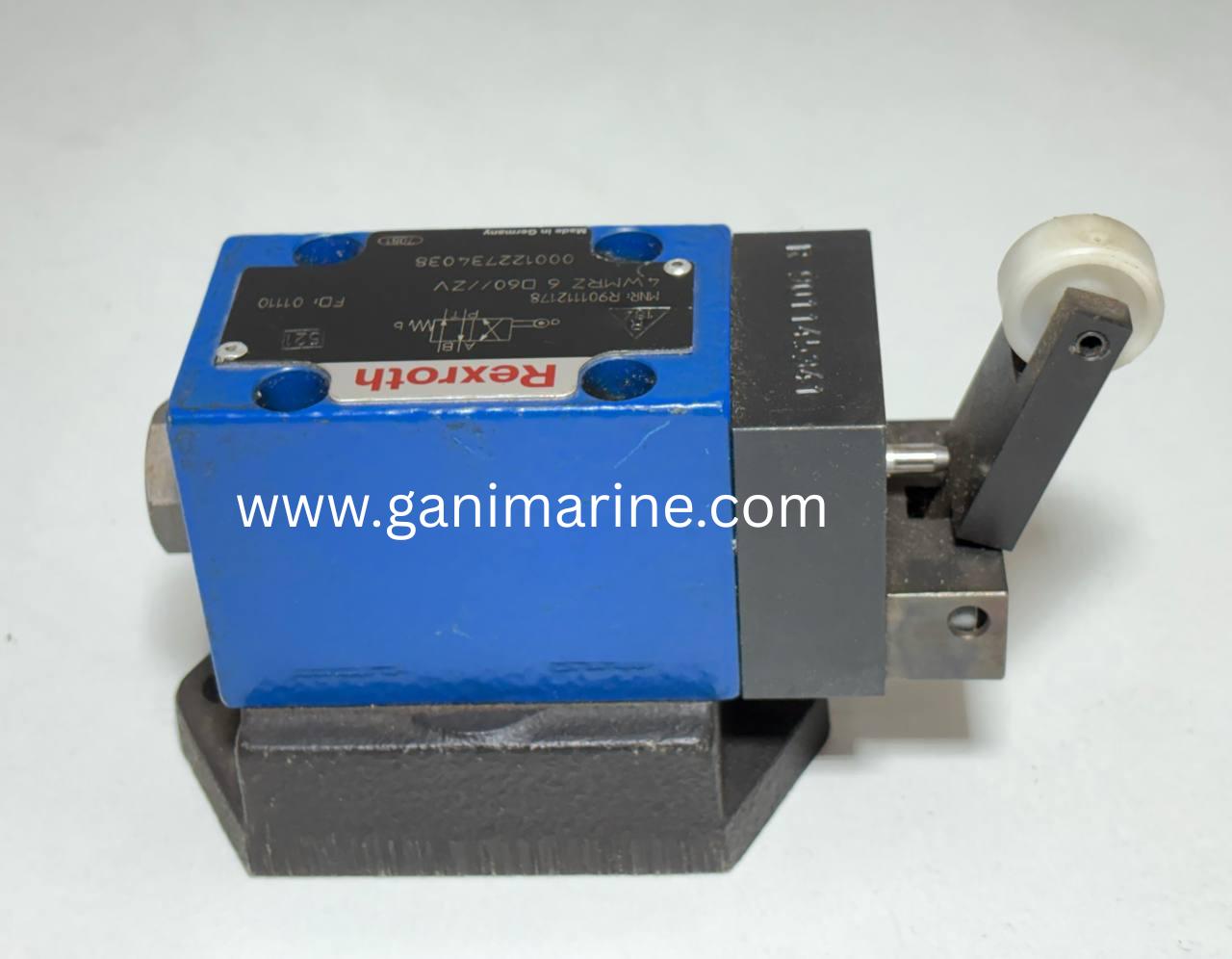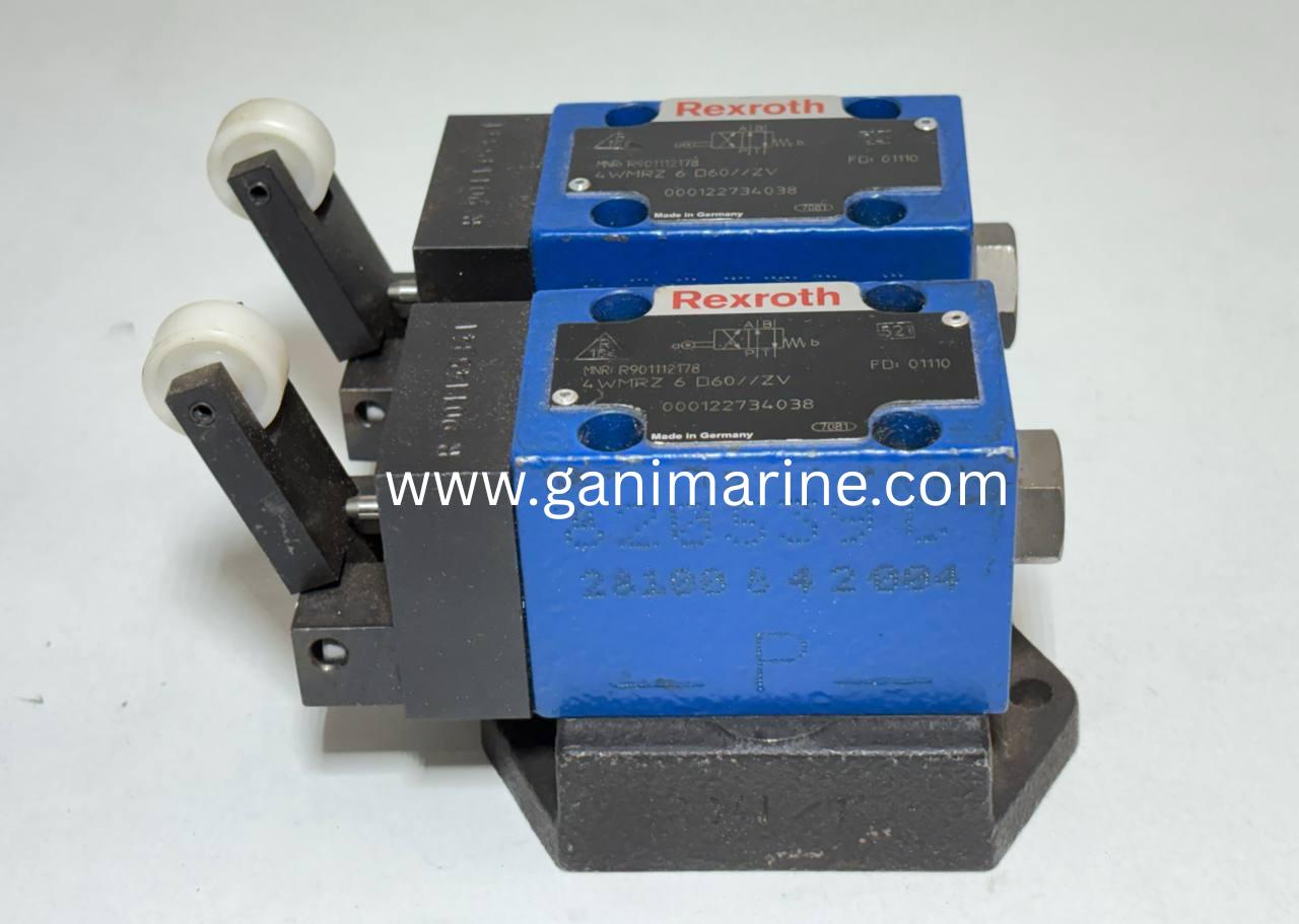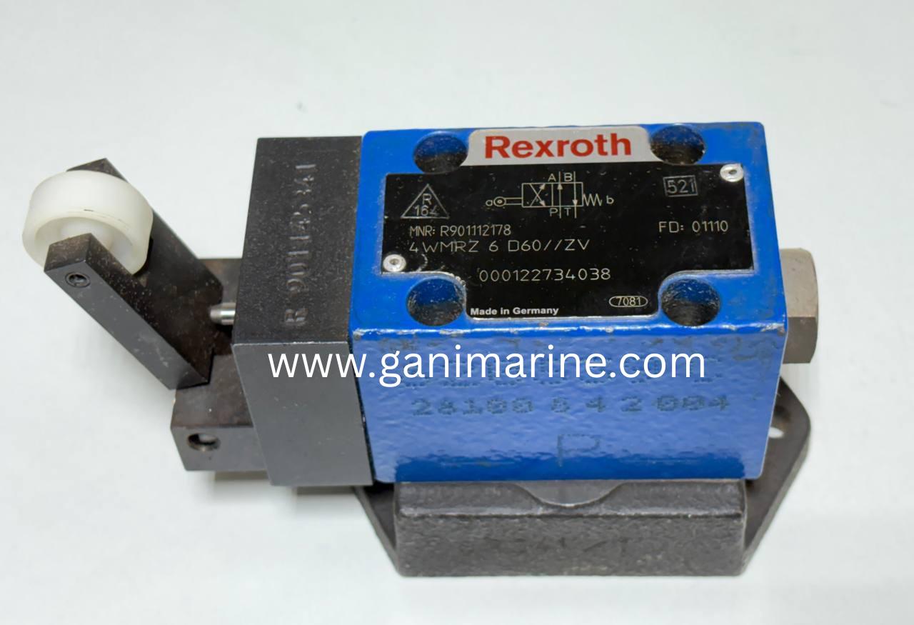 This is an original Bosch Rexroth mechanically operated 4/2-way directional spool valve, Type 4WMRZ 6 D60//ZV, Material Number R901112178, supplied with a special mounting base block stamped R901145341. Designed for heavy-duty hydraulic applications, this valve provides reliable mechanical switching using a roller lever actuation system, ideal for industrial machinery, marine hydraulics, offshore systems, and automation lines.