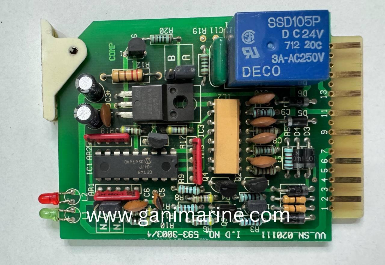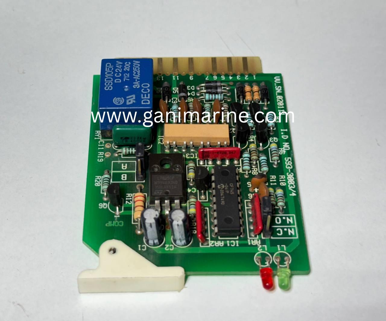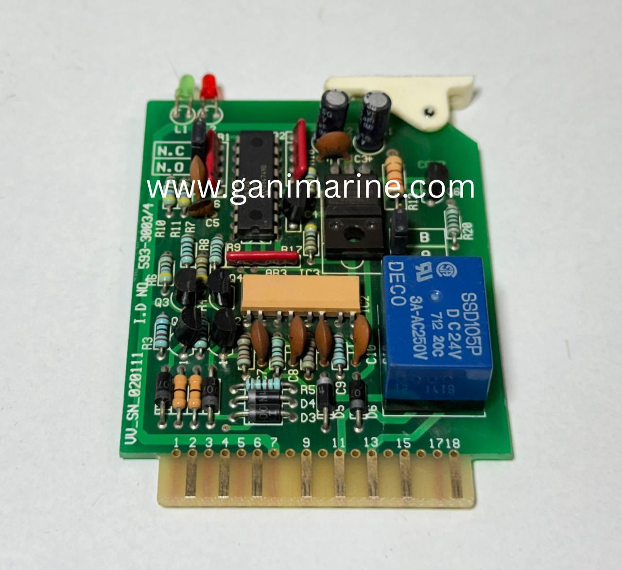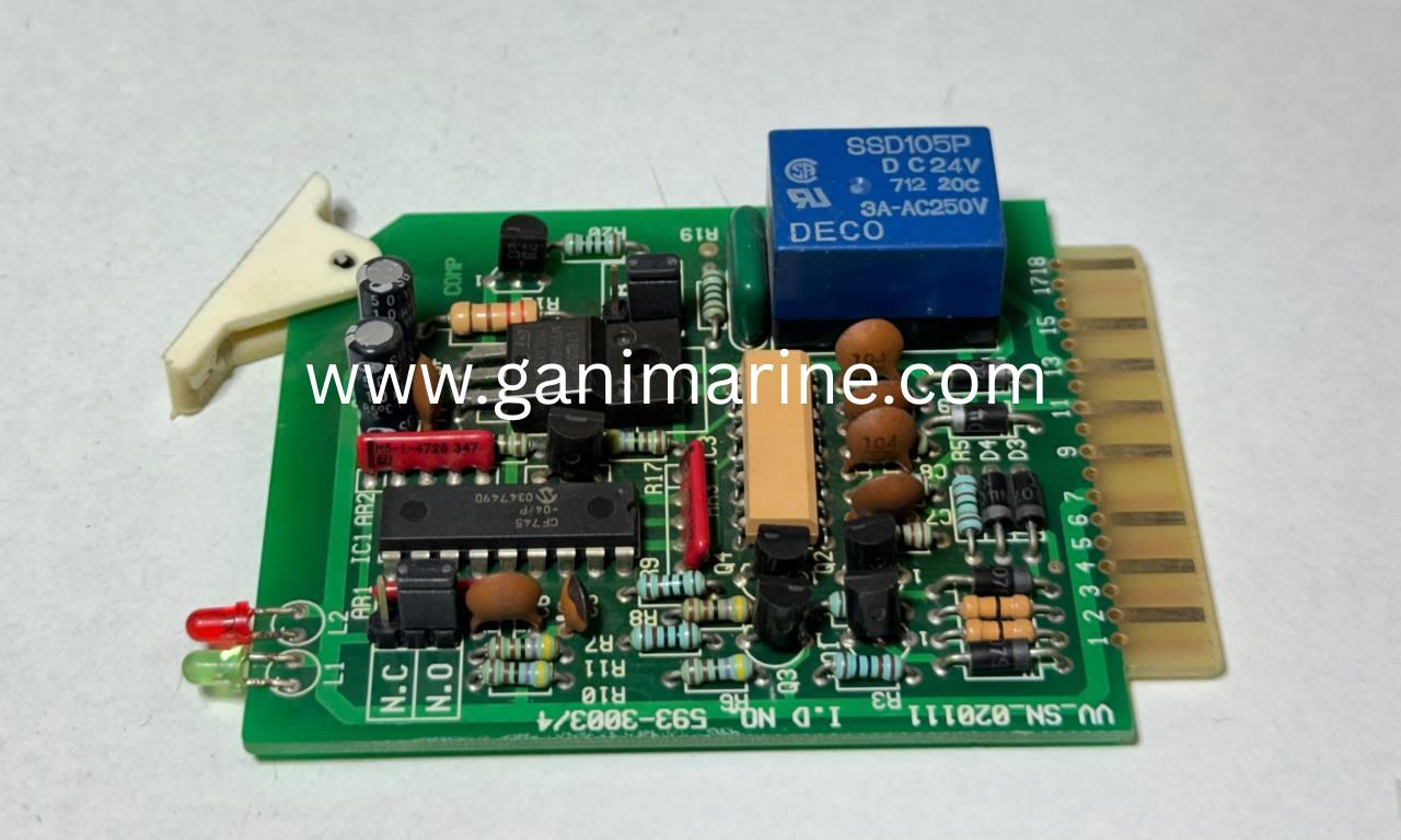 The Relay Control PCB Module (I.D. No.: 593-300314, WJ-SN: 020111) is a dedicated electronic interface board designed for industrial, marine, and hydraulic automation systems. Equipped with a 24V DC coil relay, IC logic, optocouplers, LED indicators, and discrete protection circuitry, it ensures safe signal processing, isolation, and load switching.