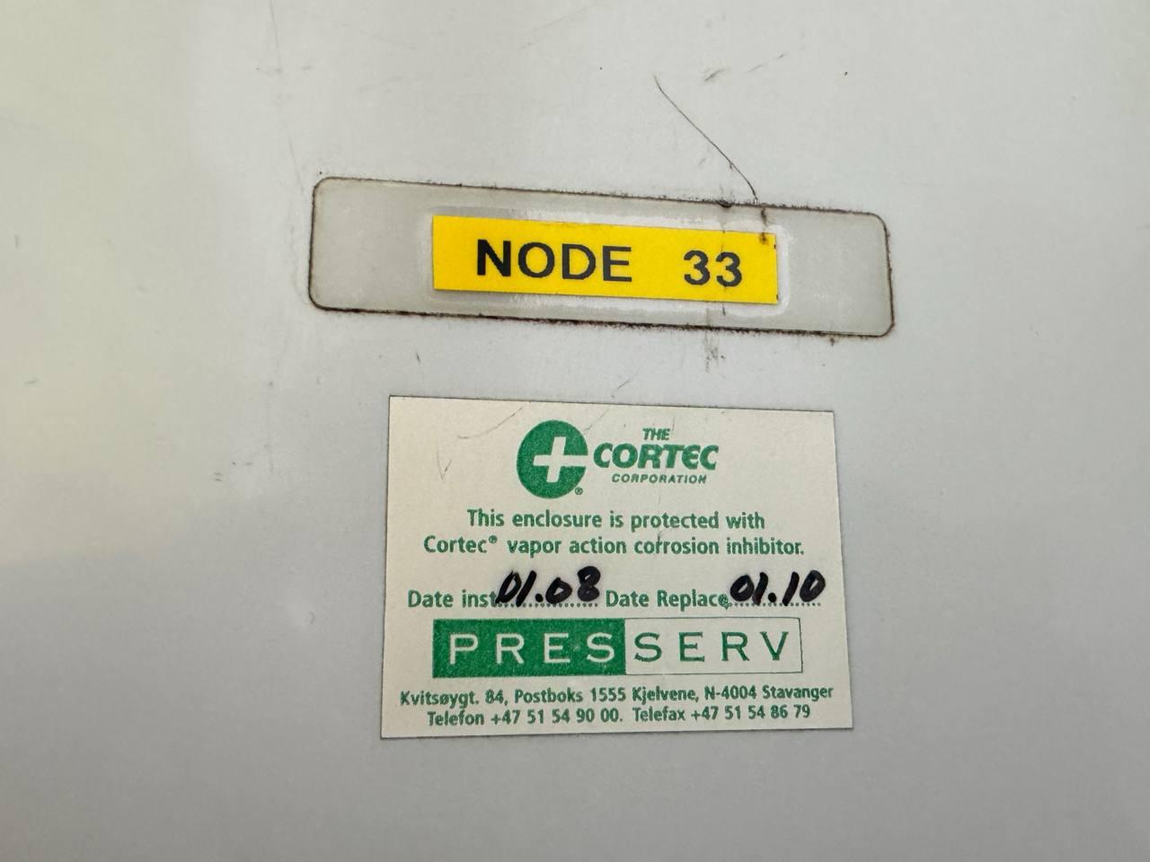 The “NODE 33” tag and Presserv corrosion inhibitor marking indicate this unit was preserved as part of a mothballed marine thruster control skid.