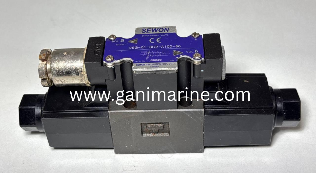SEWON DSG-01-3C2-A100-80 Directional Control Valve for industrial hydraulic systems, marine machinery, offshore equipment, and high-pressure power pack applications. Compact 01-series valve with 3-position, spring-centered spool (3C2), high-flow performance, stable switching, and long-life solenoid operation. Widely used for hydraulic cylinders, actuators, steering systems, cranes, winches, power units, and machine automation. Supplied worldwide by GANI MARINE, a trusted global supplier of genuine hydraulic valves.