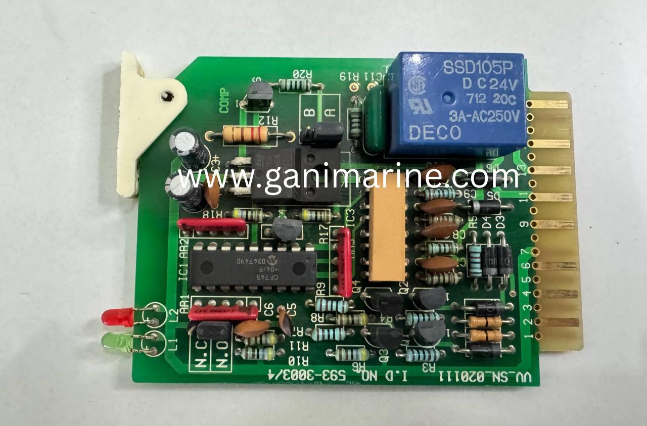 The Relay Control PCB Module (I.D. No.: 593-300314, WJ-SN: 020111) is a dedicated electronic interface board designed for industrial, marine, and hydraulic automation systems. Equipped with a 24V DC coil relay, IC logic, optocouplers, LED indicators, and discrete protection circuitry, it ensures safe signal processing, isolation, and load switching.