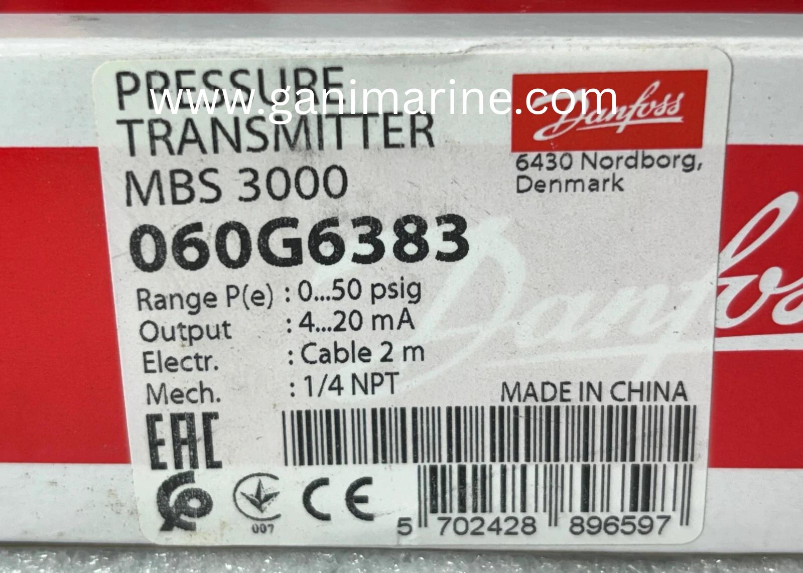 The Danfoss MBS 3000 Pressure Transmitter 060G6383 delivers high accuracy and reliability for marine, HVAC, refrigeration, hydraulic, and industrial systems. With a measuring range of 0–50 Psig, an output of 4–20 mA, a 2 m cable electrical connection, and 1/4 NPT mechanical fitting, it ensures stable pressure monitoring in demanding environments. Supplied worldwide by Gani Marine Exporter, your trusted source for genuine Danfoss pressure transmitters.