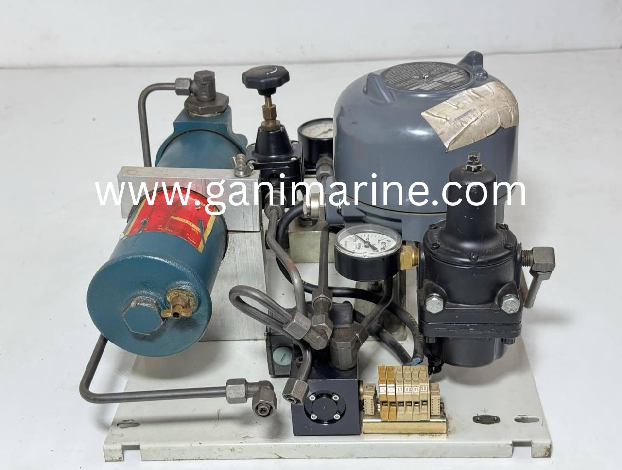 Hydraulic Control System Panel equipped with FISHER Type 546 Transducer, FAIRCHILD Catalog 20832, AMF Type 1B1A Regulator, and MECMAN 349/1 MOD C Pneumatic Module. Designed for marine, offshore, oil & gas, industrial automation and ship machinery control. High-quality, calibrated components for precision control, pressure regulation, signal conversion, and actuator operation. Supplied worldwide by GANI MARINE, a trusted global supplier of hydraulic and pneumatic control equipment.