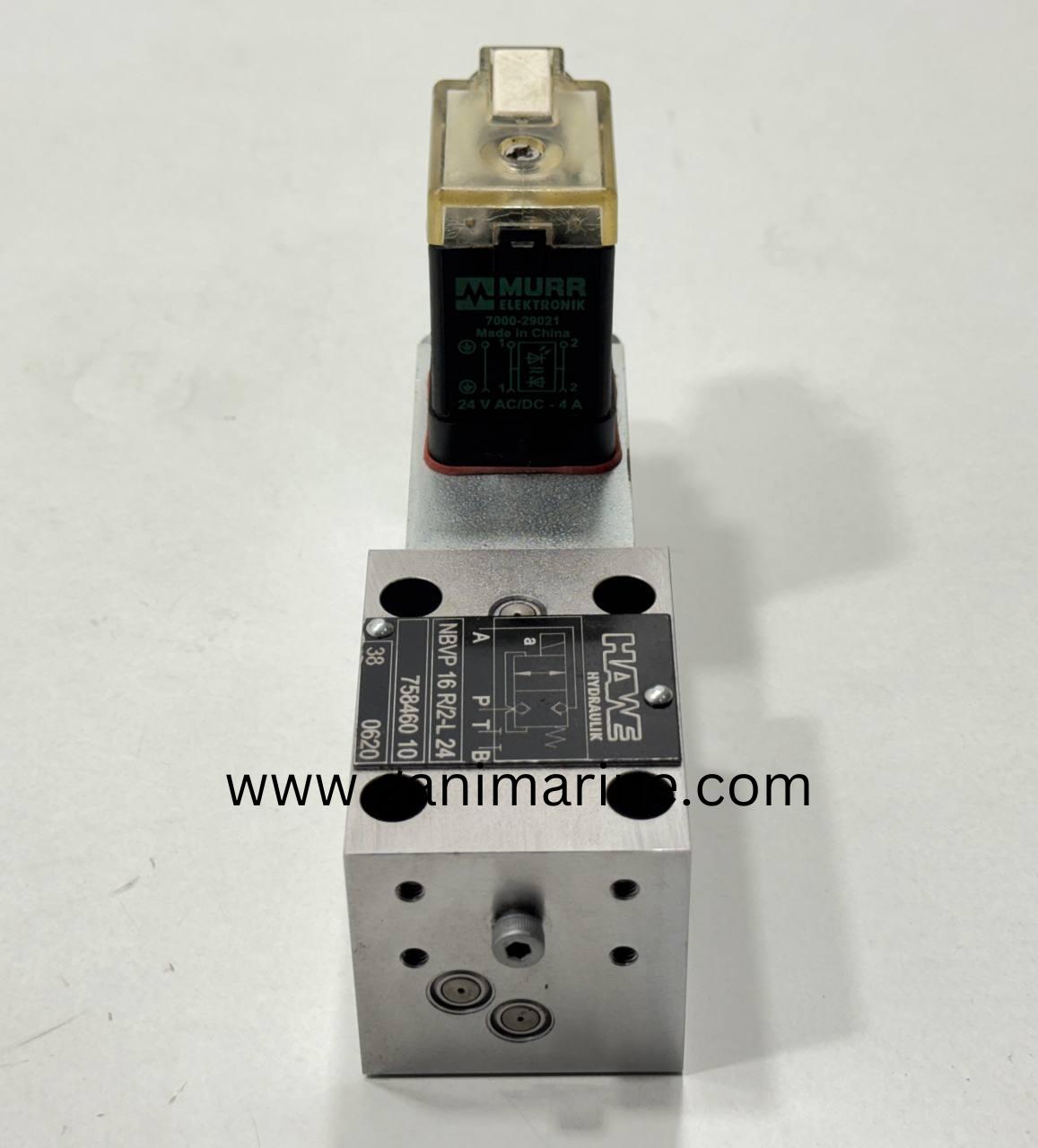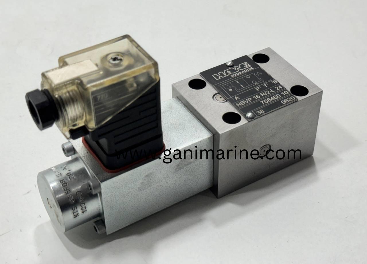The HAWE NBVP 16 R/2-L 24 is a 2/2-way solenoid operated seated (poppet) directional valve designed for zero leakage, high-pressure hydraulic applications.