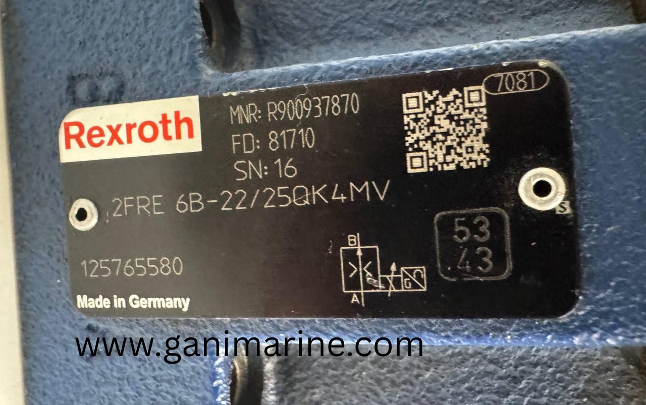The Rexroth 2FRE 6B-22/250K4MV is a high-precision proportional flow control valve, engineered for demanding hydraulic systems in marine, offshore and industrial applications. With size “6”, component series “B”, and flow rating up to 250 L/min, this model ensures accurate, load-compensated flow control via solenoid actuation. Manufactured in Germany by Bosch Rexroth and stocked by GANI MARINE EXPORTER, global leaders in marine hydraulic supply.