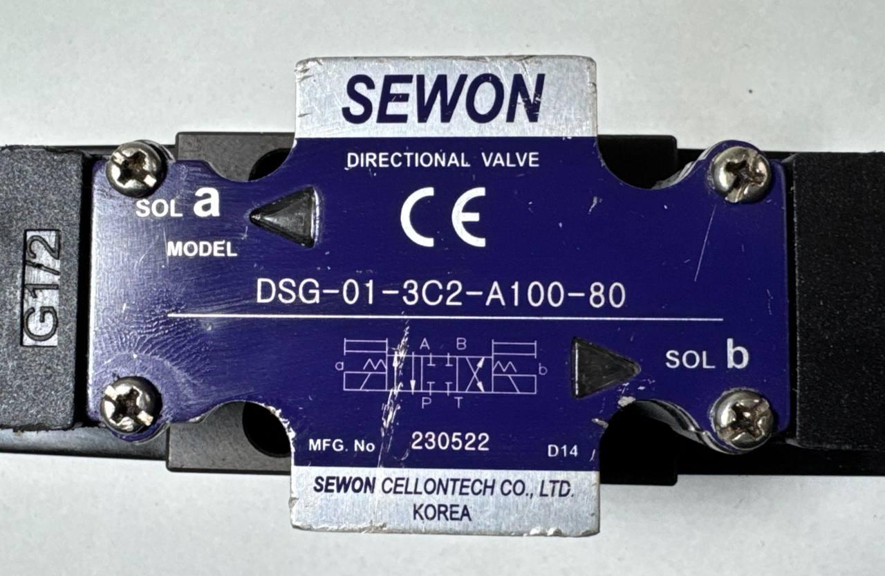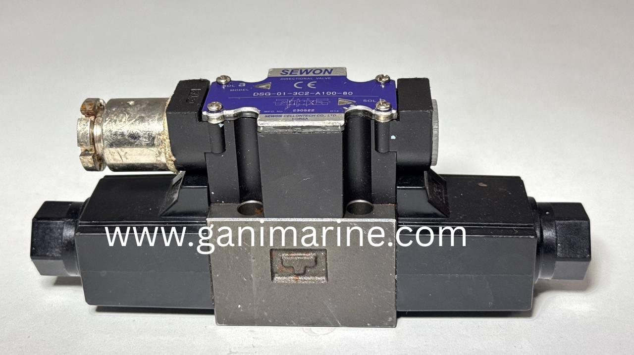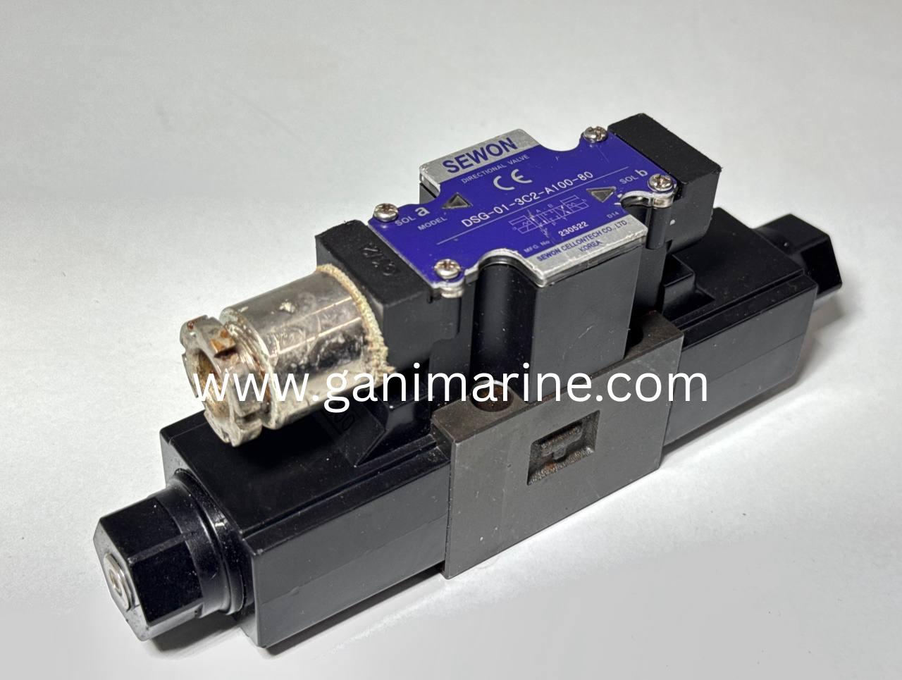 SEWON DSG-01-3C2-A100-80 Directional Control Valve for industrial hydraulic systems, marine machinery, offshore equipment, and high-pressure power pack applications. Compact 01-series valve with 3-position, spring-centered spool (3C2), high-flow performance, stable switching, and long-life solenoid operation. Widely used for hydraulic cylinders, actuators, steering systems, cranes, winches, power units, and machine automation. Supplied worldwide by GANI MARINE, a trusted global supplier of genuine hydraulic valves.